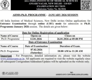 All India Institute of Medical Sciences, New Delhi invites Online applications for Entrance Examination through online (CBT) mode for admission in Ph.D. Programme January 2026 session. The details are given below: