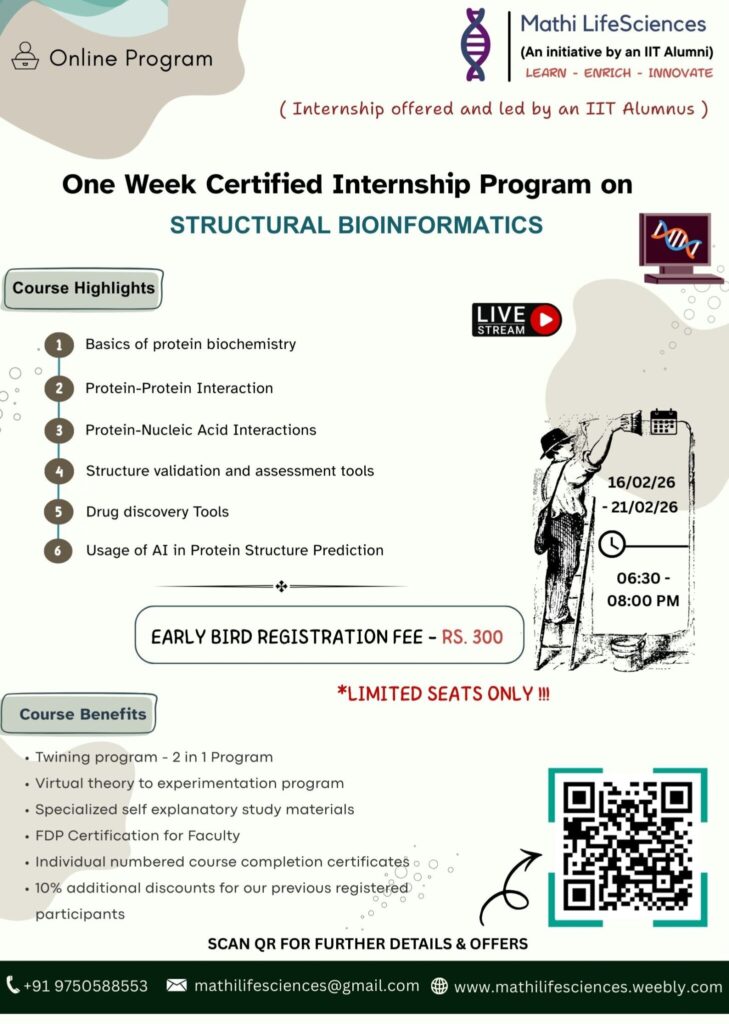 This One Week Certified Internship Program on Structural Bioinformatics is an online, live-streamed training initiative led by an IIT alumnus. It provides hands-on exposure to protein structure analysis, protein–protein and protein–nucleic acid interactions, structure validation tools, drug discovery methods, and the use of AI in protein structure prediction. Designed for students, researchers, and faculty, the program bridges theoretical concepts with practical applications.