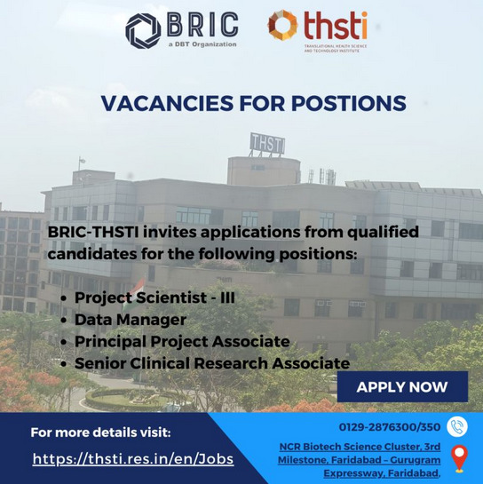 BRIC-THSTI invites applications from qualified candidates for the following positions: